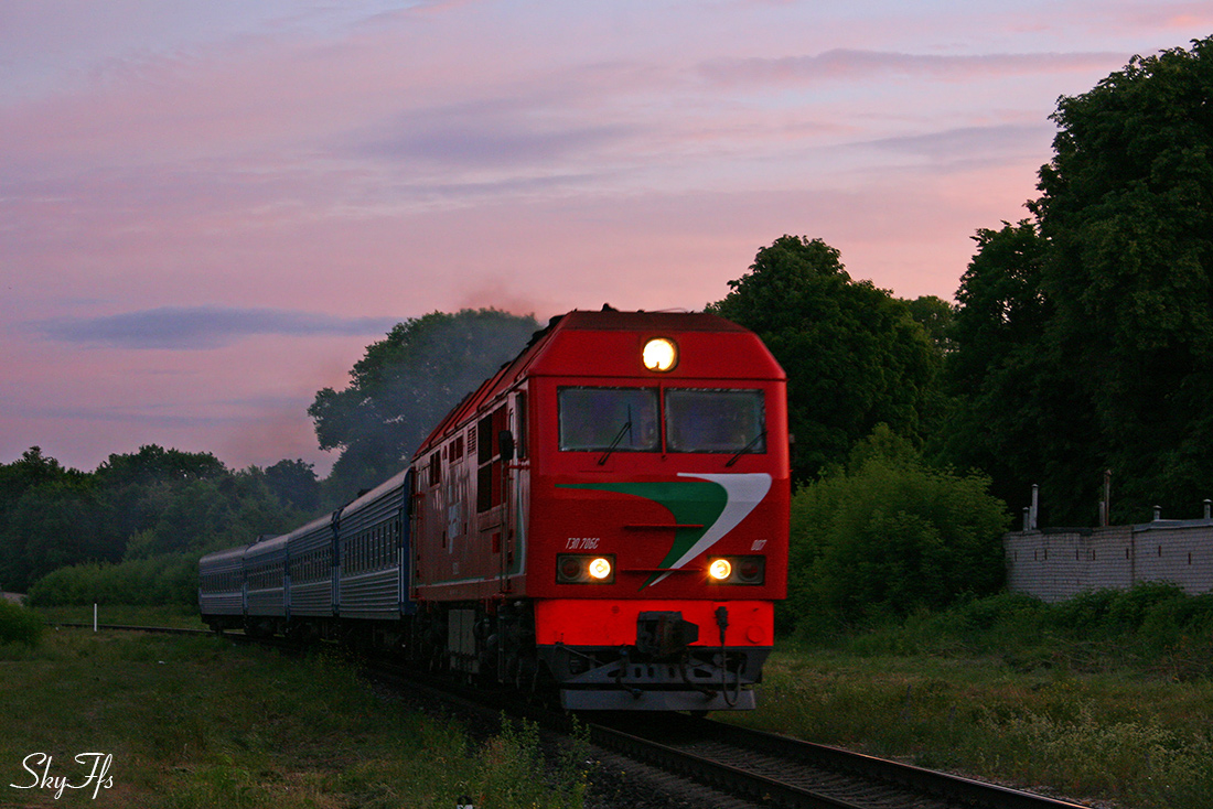 Diesel locomotive TEP70BS-007 with passenger train Riga - Minsk, Daugavpils, Latvia (29.07.2015 ...