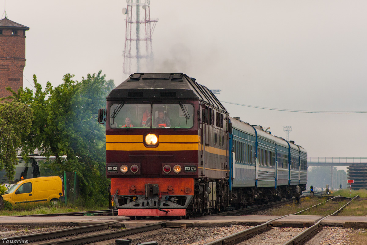 Diesel locomotive TEP70 with passenger train Minsk - Riga, Daugavpils, Latvia (26.05.2016)